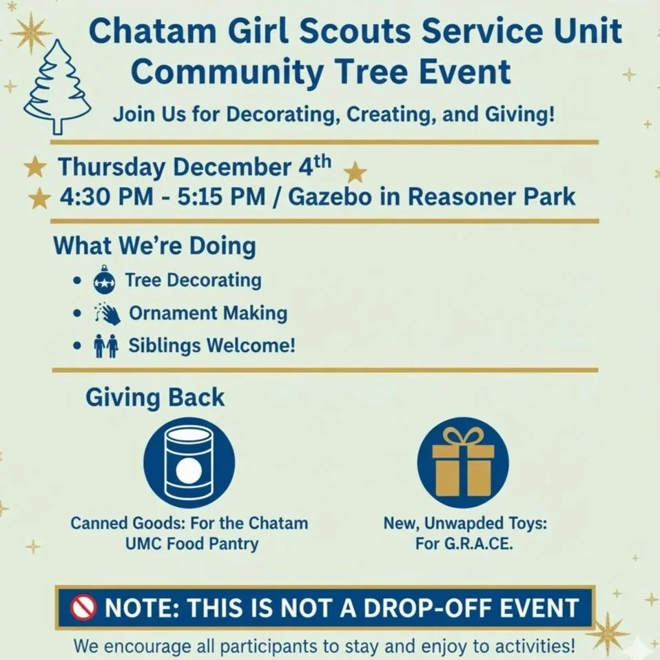 Calling all Chatham Girl Scouts families! Join us for a Tree Decorating on Thursday, December 4th. Collecting canned goods for Chatham UMC Food Pantry and/or new, unwrapped gifts for G.R.A.C.E. Please share this FREE event with your troops!