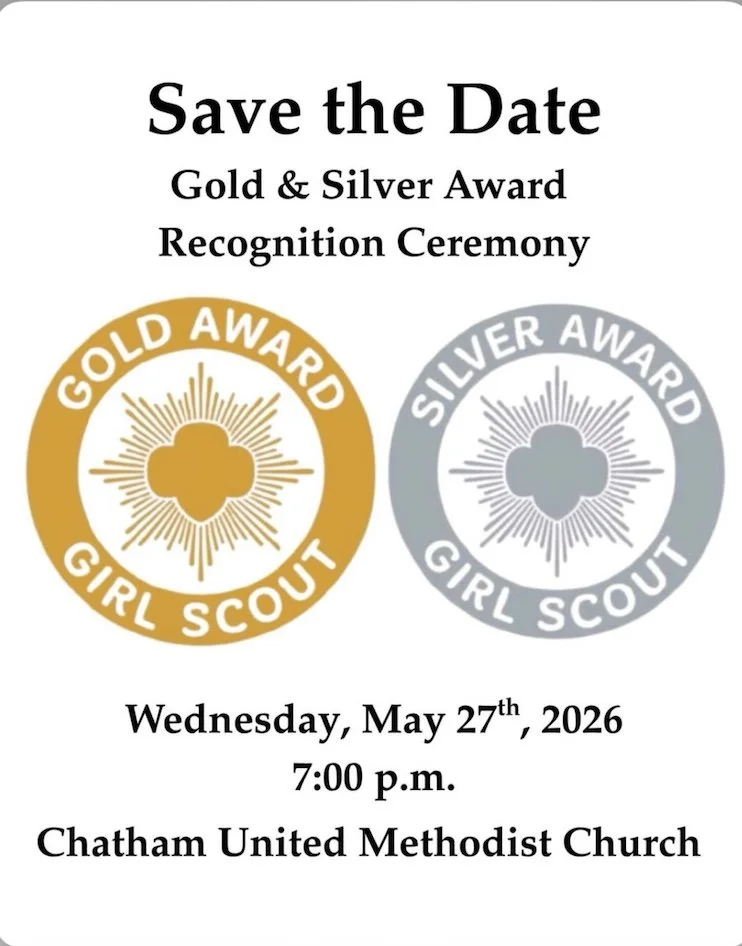 AWARD RECOGNITION CELEBRATION - Gold/Silver and Senior Awards SAVE THE DATE - Wed 5/27/26 from 7 - 8:30 pm at Chatham United Methodist Church. PLEASE USE the following LINK to sign up GIRL SCOUTS who will be recognized at the event. Each award recipient is required to provide a short write up (no more than 5 sentences) to be included in the program for the ceremony. Please email them to Jessica Romeo at jessica.romeo@gmail.com no later than May 1st to be included in the program. Gold Award recipients please also include a photo you'd like to be used in the program. Graduating Seniors - your senior photo works well for this!