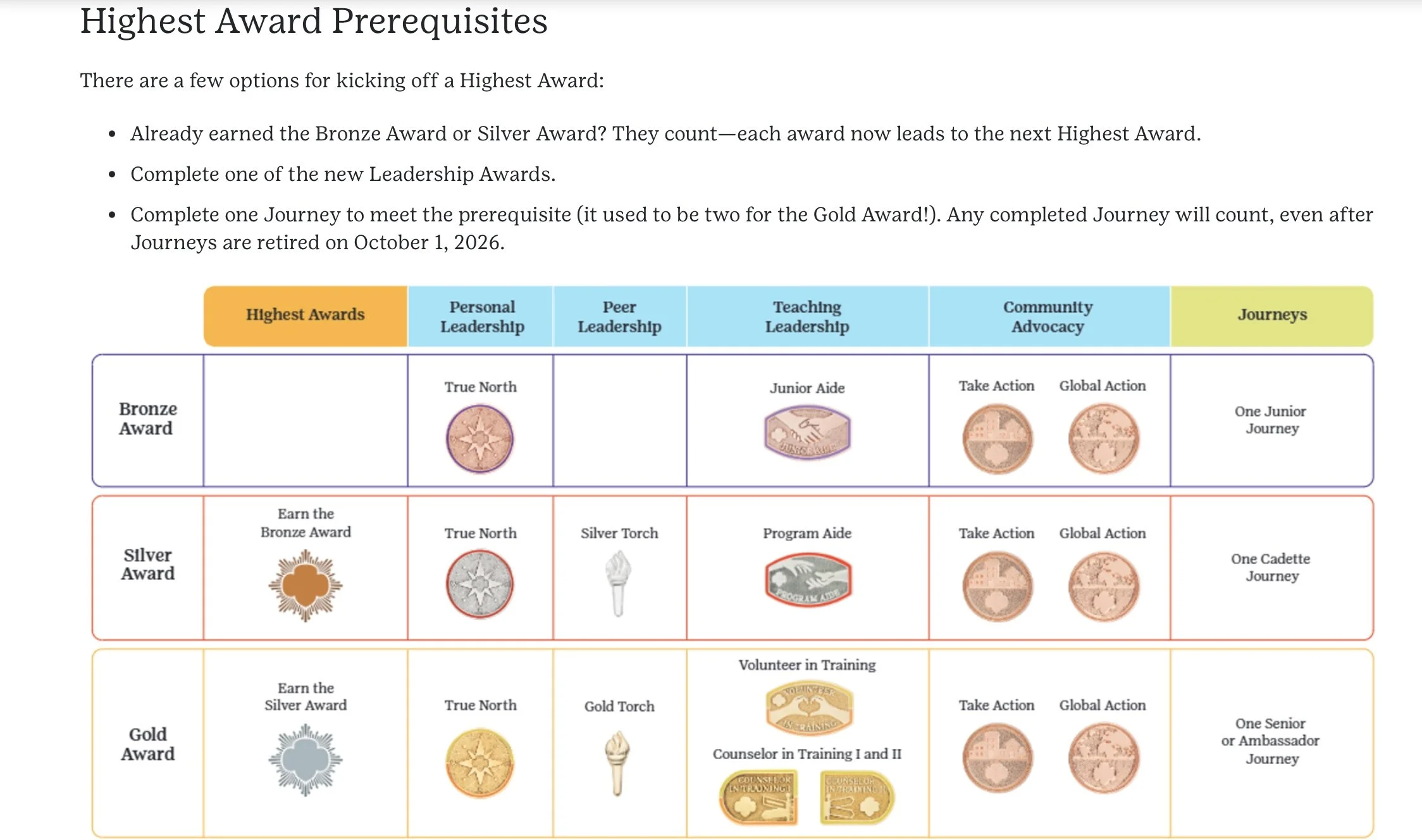CHECK OUT NEW HIGHEST AWARD PREREQUISITE REQUIREMENTS - GSUSA had made the decision to retire the National Leadership Journeys. Starting 7/14/25, there are new and updated versions of the Leadership Awards for Girl Scouts to build foundational leadership skills essential for success in earning their High Award. These changes offer more options for Girl Scouts to satisfy the prerequisites for earning the Bronze, Silver, and Gold Awards. This change has a transitional period beginning today (7/14/25) through Journeys official retirement on September 30, 2026. Click here for more details on the New Leadership Awards. from GSUSA.