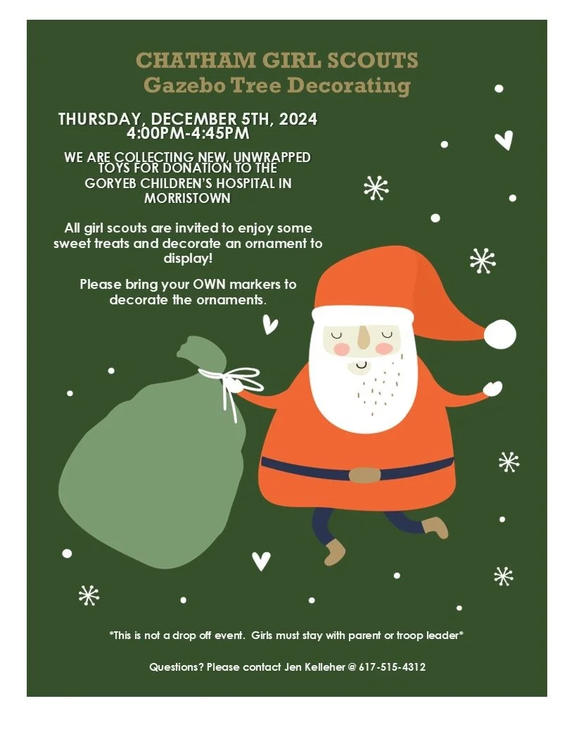 Members of all Chatham troops are invited to spread some holiday cheer and decorate an ornament for display on the tree while enjoying some sweet treats with fellow girl scouts! Any questions please reach out to Jenniferkelleher812@gmail.com
